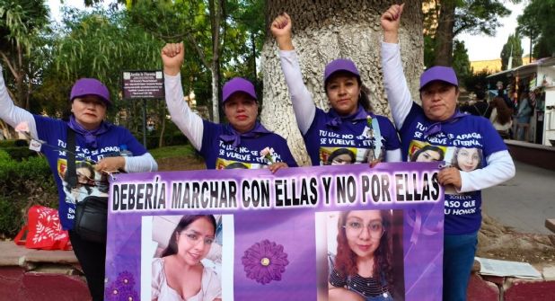 Al frente del contingente caminó Balbina Garrido, madre de Guadalupe de Jesús y Yesenia Joselín, dos de las víctimas del crimen en el Valle de Tulancingo. Vestida de morado y con el puño en alto, encabezó la movilización acompañada por sus hermanas para respaldarla en su demanda de justicia.