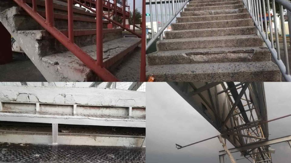 Otro puente peatonal localizado a la altura del salón Gran Foro, en el acceso a la colonia El Palmar presenta un deterioro importante. De los tres puentes visitados es el que tiene más problemas de infraestructura: los escalones están incompletos, lo que no permite que los peatones apoyen por completo el pie al momento de subir o bajar.