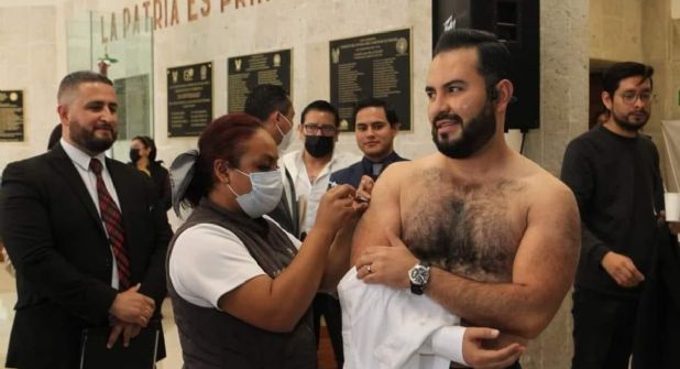 Enciso Arellano se retiró la camisa para recibir la vacuna y aprovechó para presumir su trabajo de gimnasio, tal como lo hizo anteriormente su ex jefe Omar Fayad Meneses, el pasado 24 de junio de 2021, cuando le tocó recibir el biológico contra covid-19.