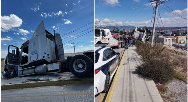 La unidad de carga, un Kenworth blanco sin remolque, salió de la cinta asfáltica de la Pachuca-Actopan, subió una banqueta y terminó en una ladera.