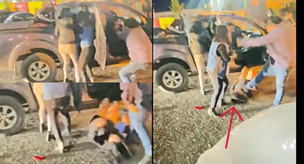 La riña quedó registrada en varios videos, que después fueron difundidos en redes sociales y retomados por diferentes medios de comunicación. En la grabación se observa que un hombre, de unos 50 años de edad, que usa una camisa color purpura, unos jeans azul claro y unos zapatos negros, toma de la cabeza a una mujer de falda negra, la baja de la camioneta, en el suelo, le patea la cabeza, una mujer, que usa unos jeans negros, una blusa negar y un chaleco de mezclilla, le pisa el estómago y la golpea con los puños en repetidas ocasiones.
