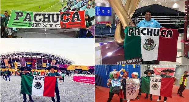 PACHUCA.- El Mundial Qatar 2022 llega a su cuarta jornada de futbol y la afición mexicana ha destacado por su alegría, porras, sombreros, máscaras, cantos y hasta el famoso grito del “fierro viejo”. Pero entre todo el color y picardía mexicana también hay tuzos. En redes sociales comienzan a circular las fotografías de los aficionados pachuqueños quienes viajaron desde la Bella Airosa a Qatar para apoyar no solo a la Selección Mexicana, sino también a los futbolistas del Club Pachuca que forman parte de los convocados por el técnico Gerardo Tata Martino.