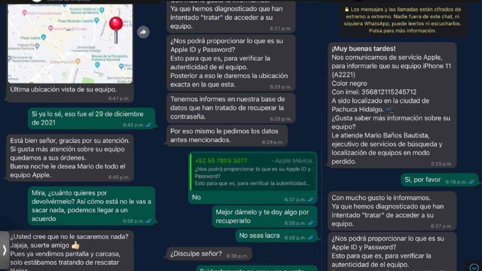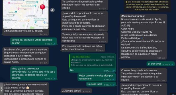“¡Muy buenas tardes! Nos comunicados de servicio de Apple para infórmale que su equipo fue localizado en la ciudad de Pachuca, Hidalgo (…) ¿nos podrá proporcionar lo que es su Apple ID y Password? Esto para verificar la autenticidad del equipo, posterior a eso le daremos la ubicación exacta”, fue uno de los mensajes que recibió.