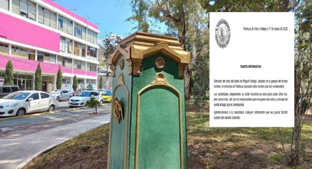 PACHUCA.- El ayuntamiento de Pachuca reprobó el robo del busto de Miguel Hidalgo el lunes en el parque del miso nombre y además calificó el hecho como condenable.