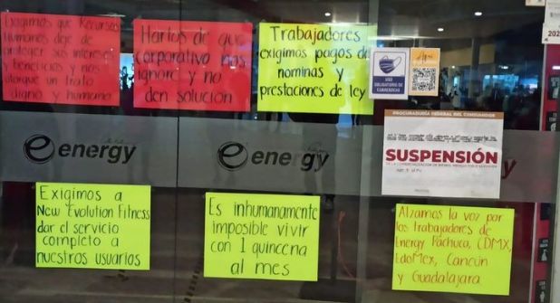 “Trabajadores exigimos pagos de nómina y prestaciones de ley”, “Exigimos dar el servicio completo a nuestros usuarios”, “Es inhumanamente imposible vivir con una quincena al mes”, “Hartos de que el corporativo nos ignore y no nos dé solución”, son algunas de las leyendas que los empleados dejaron pegadas en las puertas del gimnasio.