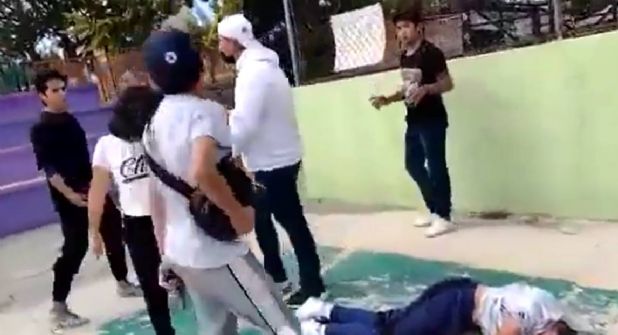 Uno de ellos levanta a su compañero y de una voltereta lo deja caer y azota en el pavimento. El resto de los jóvenes grita “sin cargarse”. No obstante, el joven yace tendido en el suelo, en apariencia inmóvil.