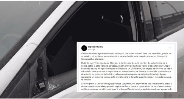 De acuerdo con el señor Sigifredo Rivera en Facebook, su hijo estacionó el viernes su vehículo en la calle Ignacio Zaragoza de Pachuca, pero a los pocos minutos fue violentado para sustraer una mochila con libretas, instrumental, expedientes y una PC.
