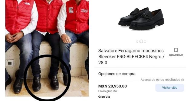 Pero en un círculo negro se resaltó los zapatos de Sierra Tello, y se señala que se trata de unos mocasines de la marca Salvatore Ferragamo Bleecker que poseen un valor de compra de 20 mil 950 pesos con envío gratuito.