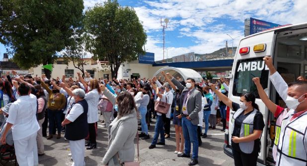 PACHUCA.- Personal de salud que labora en el Hospital General de Pachuca guardó un minuto de silencio en conmemoración a las víctimas que perdieron la vida en los sismos de 1985 y 2017.