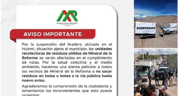 En otra parte de su comunicado, publicado en redes sociales, la alcaldía asentó que lo anterior se debe a la suspensión del tiradero a cielo abierto de El Huixmí en Pachuca, lo que implicará que las unidades recolectoras no puedan cumplir su ruta.