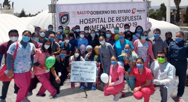 PACHUCA.- Entre porras y un ambiente festivo, personal médico y administrativo vio salir a la última paciente del Hospital de Respuesta Inmediata Covid-19, en Pachuca, Hidalgo, acto que representó el fin de un ciclo de largas jornadas laborales de combate al coronavirus.