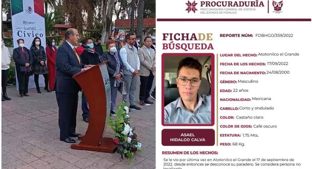De acuerdo con fichas de búsqueda que le fueron activadas a Asael Hidalgo Calva, el joven fue visto por última vez el 17 de septiembre en la colonia El Tinacal de Atotonilco el Grande, cuando manejaba un Chevrolet Corsa gris.
