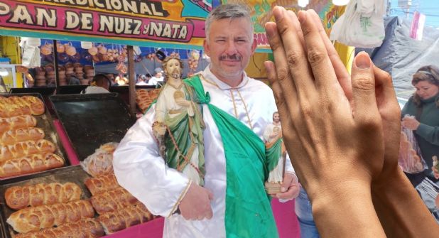 Aunque es el día de San Judas, también hay devotos de Malverde que lo llevaron a escuchar la Santa Misa, pues aseguran que comparte fecha de celebración con San Judas, Saúl Garrido agradece los favores en el trabajo, en la salud, en el negocio que tiene de corte de plantas.
