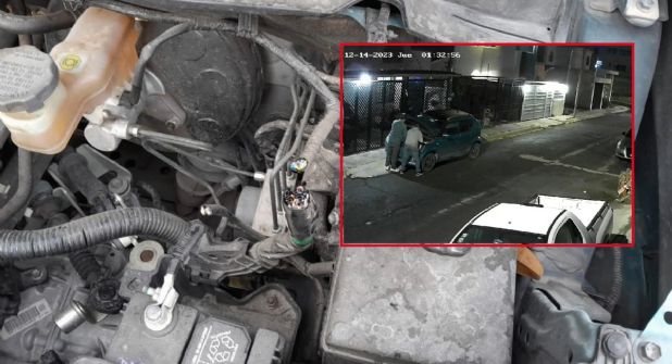 Con vestimenta de pantalones de mezclilla, sudaderas, tenis y gorra, los dos hombres toman cerca de dos minutos para consumar el delito. Uno de ellos maniobra por debajo del auto quizá para romper los seguros, alarma y posiblemente desactivar la computadora. Posteriormente abren el cofre y en cuestión de segundos toman lo que el denunciante dice ser la computadora del vehículo Suzuki Ignis para huir del lugar con rumbo desconocido.