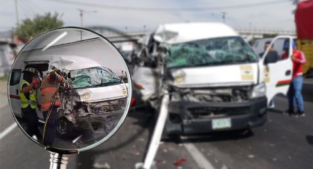 PACHUCA.- El probable exceso de velocidad y la falta de precaución al volante ocasionaron que una combi protagonizara un brutal choque y dejara prensado a un joven pasajero en la autopista México-Pachuca, además de otras personas heridas, lo que causó tráfico y una fuerte movilización de las autoridades.