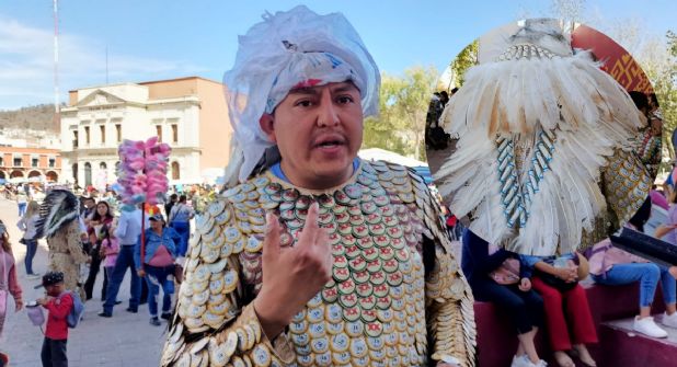 Miguel porta un traje de Comanche elaborado con corcholatas aplanadas, comenta que para cubrir la tela se requieren entre siete y ocho mil fichas aplanadas, lo que equivale a siete u ocho cuartillos de fichas de la cerveza que más se consume en el municipio y sus alrededores.