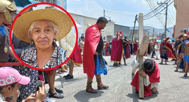 La entrevista con doña Elvira se hizo caminando a la par del paso de Jesús, interpretado por el joven de 23 años de edad Adrián Pérez Juárez quien cargó una cruz de 95 kilogramos hasta cerro del Cuixi. Ahí, la mujer, no dejaba de mirar la forma en la que centuriones daban de latigazos al hijo de Dios.
