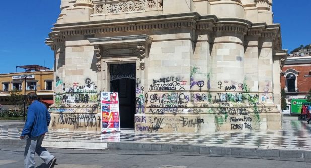 A menos de un mes que el emblema de la ciudad de Pachuca cumpla 113 años, permanecen las pintas feministas realizadas en los pasados 8M (Día de la Mujer); además, el piso de la Plaza Independencia luce roto y sin losetas mientras que el Centro Cultural del Reloj permanece cerrado por filtraciones de agua.