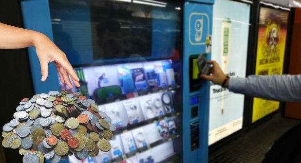 Por lo que el viajero insertó un billete al aparato y tecleó la combinación donde estaba el cargador que quería; la computadora hizo el procedimiento y despachó lo que la persona pidió para de inmediato efectuar más operaciones para dar el cambio al restar la cantidad del billete ingresado con la del artículo.