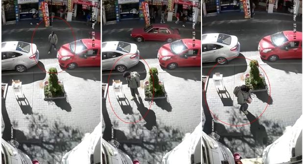 El individuo porta chamarra gris con gorra y cubrebocas en tonalidad negra; ya en la banqueta, hizo una pausa para voltear hacia su derecha donde estaba una pequeña mesa donde se exponían galletas y champú a los peatones, cuya venta era de tipo benéfico para recaudar fondos para canes.