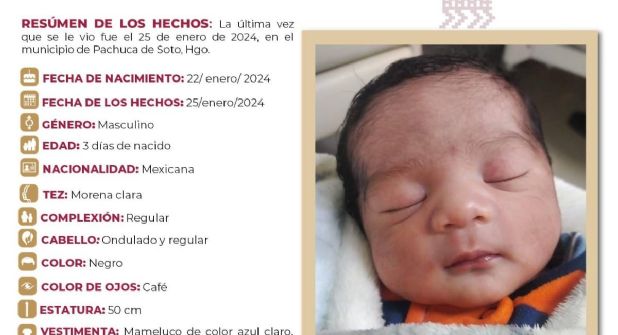 Se informó también que agentes de la Procuraduría General del Estado de Hidalgo (PGJEH) han actuado colocando operativos de revisión en las carreteras entradas y salidas de la entidad donde posiblemente pudo haber huido la mujer con el bebé. Hasta el momento, no hay reporte favorable sobre la localización de ninguno de los dos.