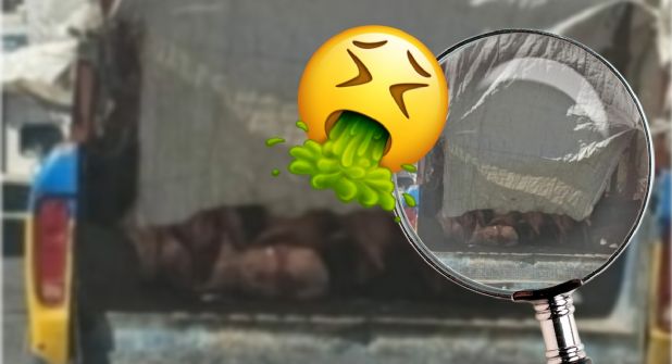 Pero hay más en la asquerosa escena descrita líneas arriba, ya que la batea de la camioneta donde se transportaba la carne de puerco estaba cubierta con costales amarrados en el armazón de fierro, mismos que lucían sucios, desgarrados y revoloteaban debido a que no fueron asegurados de manera correcta.