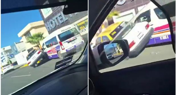 Tras varios movimientos bruscos para tratar de seguir su camino, los vehículos de pasajeros chocaron violentamente, para lo cual subieron a la banqueta, justo a la orilla del establecimiento de hospedaje, y de ello fue descrito que el taxi, un Nissan Tsuru, quedó encimado de la camioneta.