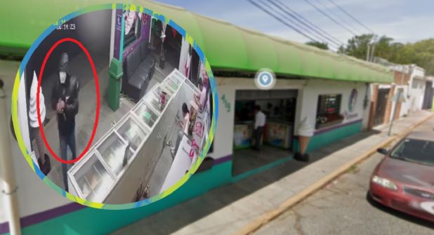 Sin embargo, a las 20:30 horas con 56 segundos desde su entrada lateral llegó un hombre de complexión median y vestido de negro una chamarra negra con blanco, gorra, pantalón de mezclilla azul, tenis negros y un cubrebocas, y se paró frente a uno de los mostradores aparentando ser un cliente nocturno.