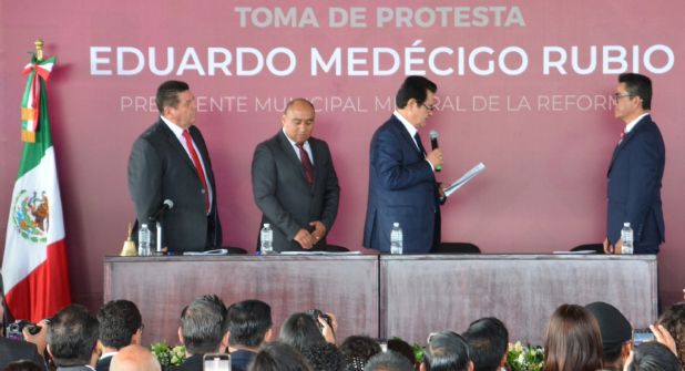 Acompañado por el secretario de gobierno, Guillermo Olivares Reyna, en representación del gobernador del estado, Julio Menchaca, se llevó a cabo la toma de protesta del alcalde, síndicos y regidores. Durante el acto protocolario, Medécigo Rubio manifestó el compromiso de trabajar conjunto con la sociedad.