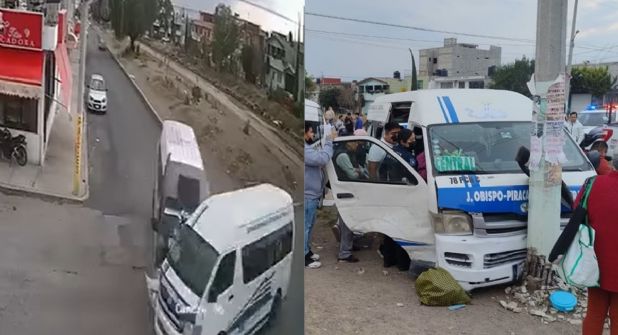 El choque entre las 2 combis ocurrió en el cruce de las avenidas Federalismo e Insurgentes, de la colonia Parque de Poblamiento en Pachuca. Mediante un video que circula en redes sociales captado por una de las cámaras de seguridad se observa el momento del accidente y cómo ninguna de las unidades cedió el paso, ni disminuyó la velocidad. Por el impacto, la combi de la ruta Central-Piracantos-Jorge Obispo terminó estrellada contra un poste de la vía pública.