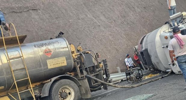 En ese sentido, pudo conocerse que portaba placas con el número 1999, que indica que transporta sustancias químicas, concretamente alquitrán, mismo que se derramó sobre el asfalto y quedó regado en un área de unos cuantos metros, por lo que primero se solicitó otro carro cisterna para hacer el vaciado del dañado.