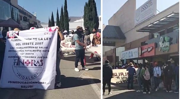 Los docentes se sumaron este día en protesta para exigir la abrogación de la Ley del ISSSTE 2007, así como mejoras en los servicios médicos y jubilaciones dignas. Esta tarde salieron diferentes frentes de la Escuela Normal Superior Particular del Estado de Hidalgo y la Universidad Siglo 21, quienes con una bandera en rojo y negro anticiparon el estallamiento de un paro de labores nacional por tiempo indefinido, de no recibir respuesta satisfactoria a sus peticiones.