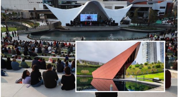 A los costados del foro hay puentes para cruzar el lago y en medio es donde queda el espacio para que artistas, músicos, expositores y más puedan dar gala de su talento y el techo es adulado al imitar la ópera de Sídney, en Australia; para que los asistentes permanezcan, hay pasto artificial y cemento que se dice es cómodo.