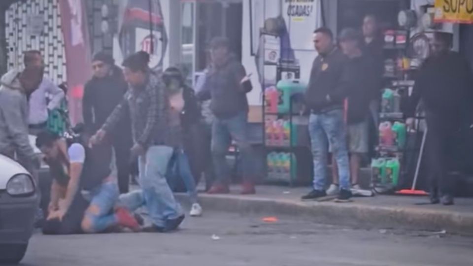 De acuerdo con la información que circula, señalan los sujetos son empleados de uno de los comercios de autopartes. En el sitio se observan por las imágenes del video al menos 8 “mirones”, entre ellos una mujer con un celular en mano como marcando a algún número, quizás para pedir auxilio.