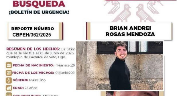 PACHUCA.- El estado de Hidalgo suma otro joven desaparecido y ahora se trata de Brian Andrei Rosas Mendoza, quien este miércoles 4 de junio suma cuatro días sin saber de su rastro, ante lo cual fue aseverado que es una buena persona, así como artista e incluso participó en un concurso internacional.