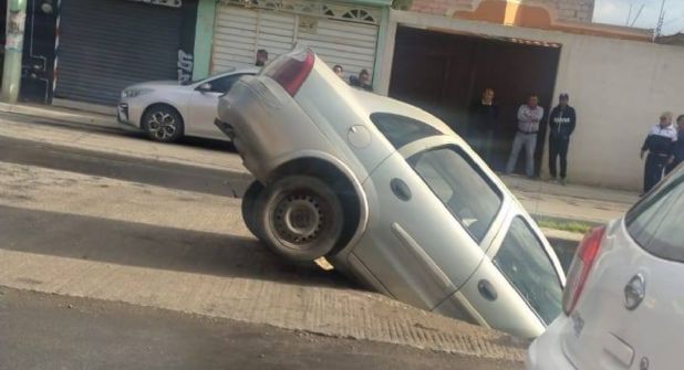 El peculiar accidente ocurrió sobre la avenida de los Árboles en el fraccionamiento Forjadores, perteneciente al municipio Mineral de la Reforma. En la zona atraviesa un dren pluvial, donde el auto quedó dentro con las 2 primeras llantas.