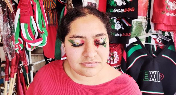 Érika se pintó la silueta de una mariposa en rojo, blanco y verde, con un toqué de brillos dorados al centro, que simulan el águila devorando una serpiente sobre un nopal, y motas negras en su ojo izquierdo.