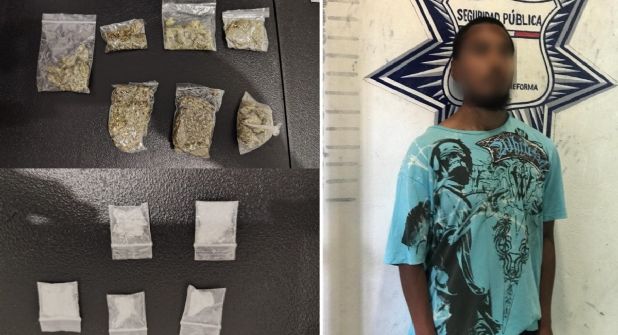 Al notar ese comportamiento, los elementos policiacos le dieron alcance. Luego de intervenirlo, la persona se identificó con el nombre de iniciales, E.E.M.M. de 34 años. Durante la inspección, la policía le localizó en posesión 5 bolsas de cristal y 7 envoltorios de marihuana.