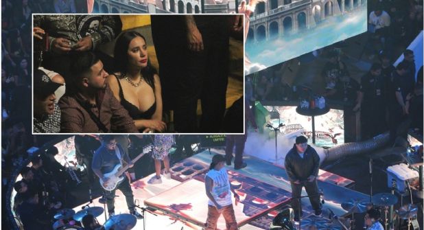 Quien suele tener un estilo de vida polémico de inmediato fue captado entre el público, específicamente entre las primeras hileras, a solo metros de donde estaban los músicos de Grupo Firme con sus respectivos instrumentos que ya los hacían sonar para amenizar la noche y dar un buen espectáculo.