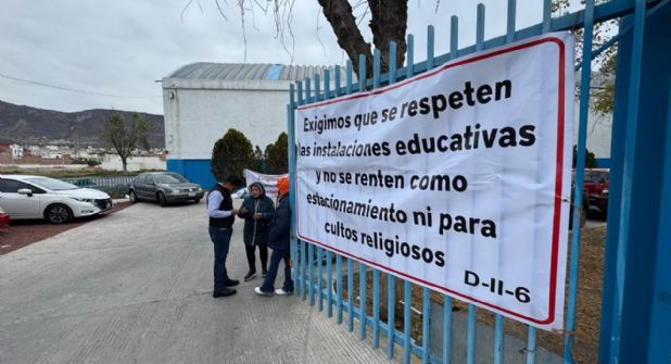 Entre los mensajes exhibidos se leían frases como: “Exigimos sanciones a los aviadores”, “Exigimos que se respeten las instalaciones educativas y no se renten como estacionamiento ni para cultos religiosos” y “Exigimos justicia, que se retire al director acosador, José Luis Hernández Hernández”.