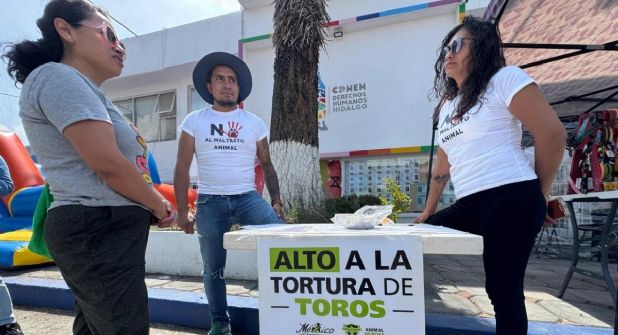Pachuca.— Este domingo, activistas en defensa de los animales realizaron una jornada de recolección de firmas en las inmediaciones de la Comisión de Derechos Humanos en Pachuca, con el objetivo de respaldar una iniciativa que exige la prohibición de la tauromaquia en el estado de Hidalgo.