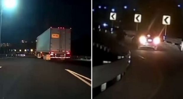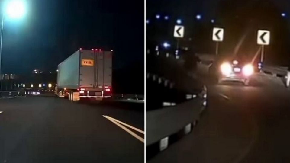 Las imágenes comenzaron con el camión saliendo de la incorporación citada arriba, lo mismo que el automóvil a solo unos metros, aunque en el acotamiento apareció otra unidad que, aunque era oscuro, se apreció era un taxi con sitio en la Ciudad de México, cuyo conductor estaba parado con sus intermitentes.
