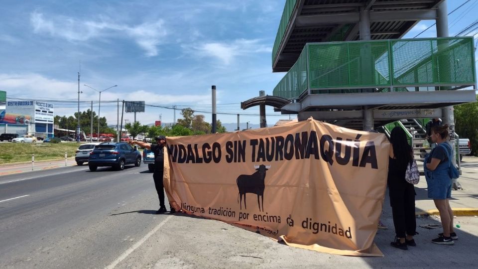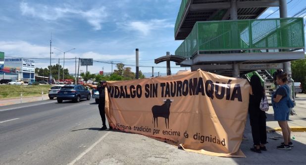 En este lugar colocaron una manta amarilla con la leyenda "Hidalgo sin tauromaquia, ninguna tradición por encima de la dignidad de un animal" y gritaron consignas como "no más corridas", "conciencia" y "no más sangre". Algunos de los automovilistas y ciudadanos apoyaron el movimiento con el claxón.