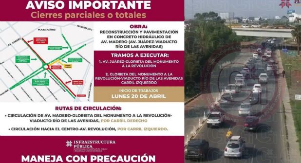 Pachuca.- A partir de hoy, lunes 20 de abril, se implementarán cierres viales parciales y totales en la Avenida Madero, como parte de los trabajos de reconstrucción y pavimentación con concreto hidráulico en uno de los principales corredores de Pachuca de Soto.