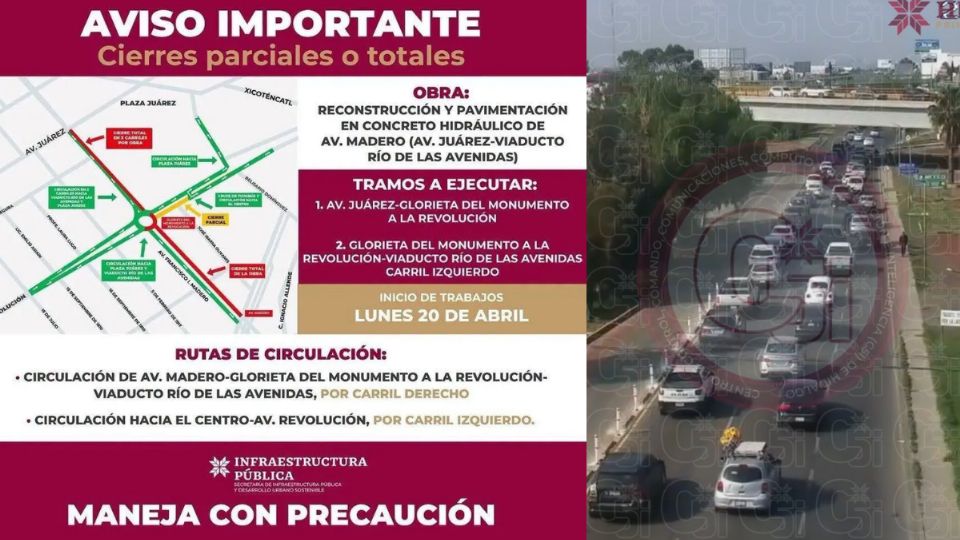 Las autoridades detallaron que habrá cierres intermitentes o totales en diversas vialidades que confluyen con Avenida Madero, entre ellas Vicente Segura, Xicoténcatl, Plaza Juárez, Belisario Domínguez, José Ibarra Olivares e Ignacio Allende, así como accesos hacia la zona centro y el Monumento a la Revolución.