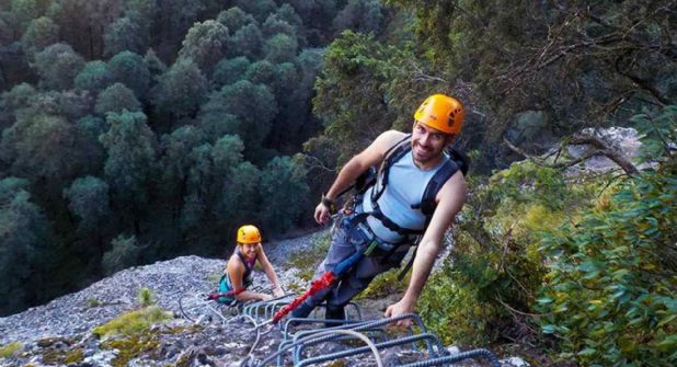 Escalerillas, puentes colgantes, barandales, agarraderas, tirolesas, entre otras estructuras metálicas que están incrustadas en las montañas rocosas son parte de la vía ferrata, la cual es una ruta por la que se puede recorrer una montaña, además a lo largo de esta existe un cable de acero para proteger a los escaladores de caer.