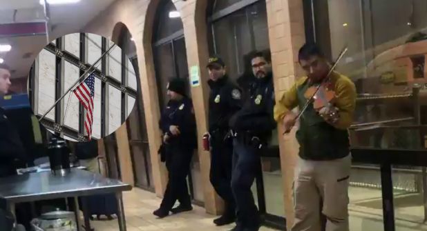 Además de algunos oficiales de la Policía de esa misma nación norteamericana que vigilan las instalaciones y algunas otras personas que acudieron a realizar trámites, pero que aprovecharon el momento para igualmente grabar la interpretación. El músico sigue sus notas huapangueras con una inspiración profunda.