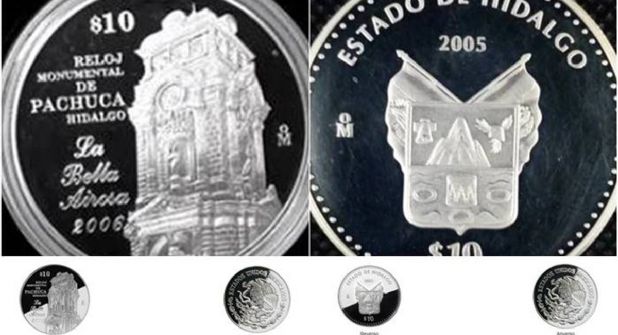 Son dos monedas de plata con un valor nominal de 10 pesos, una muestra el escudo del Estado Hidalgo y la otra el Reloj Monumental de Pachuca, del año 2005 y 2006, respectivamente, según se especifica en el sitio web del Banco de México (Banxico).