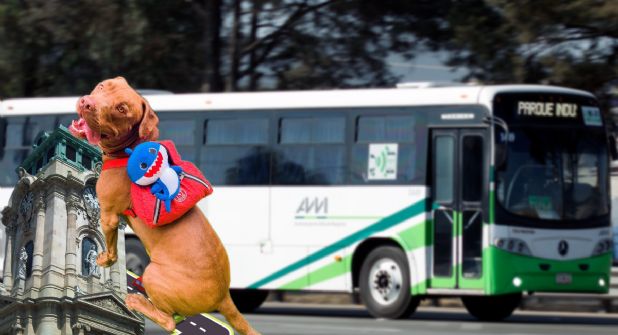 Pues el AVM realizó una escala en la central camioneta de Francisco I Madero en la esquina del edificio conocido como Hegade, donde se encuentra la base de las combis San Juan, pero cuando el chofer abrió la puerta para que los pasajeros subieran lo curioso y sorpresivo fue que el primero en abordar fue un lomito pitbull café.