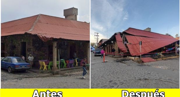 Pues los arcos colapsaron junto a sus bases e incluso partes de concreto se desmoronaron, tirando además adornos y luminarias, aunque por la hora del accidente, el negocio no estaba atendiendo a clientes y las butacas que coloca par ellos estaban guardados; sin embargo, su techo igual se afectó mucho.